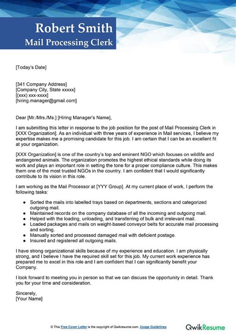 Mail Processing Clerk Cover Letter . Browse professional templates for all levels and specialties. Be sure to tailor your letter to the specific requirements listed in the job.